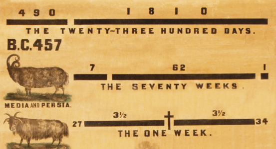 Besides the symbols of governments contained in Daniel 8, there is a definite period of time brought to view, which claims attention. The diagram of this period is seen in the upper right-hand corner of the Chart, the meaning of which will appear as we proceed to consider this period. As recorded in verse 13, Daniel heard one saint ask another the question, how long the vision should be concerning the daily [sacrifice] and the transgression of desolation to give both the sanctuary and the host to be trodden under foot. The angel then addressed himself to Daniel and said, Unto two thousand and three hundred days; then shall the sanctuary be cleansed. Waiving for the present the question as to what may constitute the sanctuary, we wish to ascertain if possible the nature, the commencement and termination of this period of time. There are two kinds of time to be met with in the Bible: literal and symbolic. In symbolic time a day signifies a year. Numbers 14:34;Ezekiel 4:6. To which class do the 2300 days belong? Being brought in in connection with acknowledged symbols, it would be both easy and natural to infer that they partook of the nature of the rest of the vision and were symbolic, presenting us with a period of 2300 years. And that such is the case is further evident from the fact, as is shown in the investigation of Daniel 8, that the field of the prophet’s vision was the empires of Persia, Greece, and Rome. The 2300 days there given cannot therefore be literal days; for literal days (scarcely six years and a half) would by no means cover the duration of any one of these empires singly, much less embrace so nearly the whole of their existence put together, as they evidently do. They must consequently denote 2300 years. Can we now ascertain the commencement of this period? We answer, Yes; the key to the matter being found in the ninth chapter of Daniel, between which and the eighth there is an unmistakable connection, as we shall now endeavor to show.