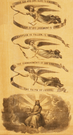 At the left of the Sanctuary we have the illustration of three angels flying through heaven, followed by a royal personage coming in the clouds of heaven with power and glory. These angels are the three angels brought to view in Revelation 14:6-12. When we talk of the first, second and third angel’s messages, we are frequently accused of being fanciful in our ways of Scripture. But we wish to ask plainly every person who respects the sacred text, if there are not three angels spoken of in Revelation 14, in consecutive order, the last called the third, by which the other two are recognized as the first and second? 2. Have they not each a special message to proclaim? 3. Is it not therefore eminently proper and scriptural to speak of the first angel’s message, the second angel’s message, and the third an gel’s message? All must admit that it is. Let no fault, then, be found with our phraseology of these messages, while we proceed to offer a few reasons for our application of them.