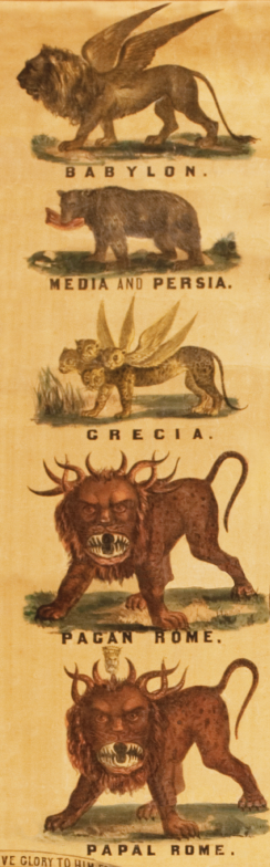 At the right of the image stands a line of beasts, a lion, a bear, leopard, and nondescript beast in two forms, representing another vision. A view of these beasts was given to Daniel in vision, as recorded in chapter 7, of his prophecy. In verse 17, these beasts are declared to be four kings or kingdoms. The manner of their rise, Daniel describes in verse 2, thus: I saw in my vision by night, and, behold, the four winds of the heaven strove upon the great sea, and four great beasts came up, diverse one from another. Seas denote nations and peoples. Revelation 17:15. Wind denotes war and strife. Hence these kingdoms rose and fell through revolutions and political strife.